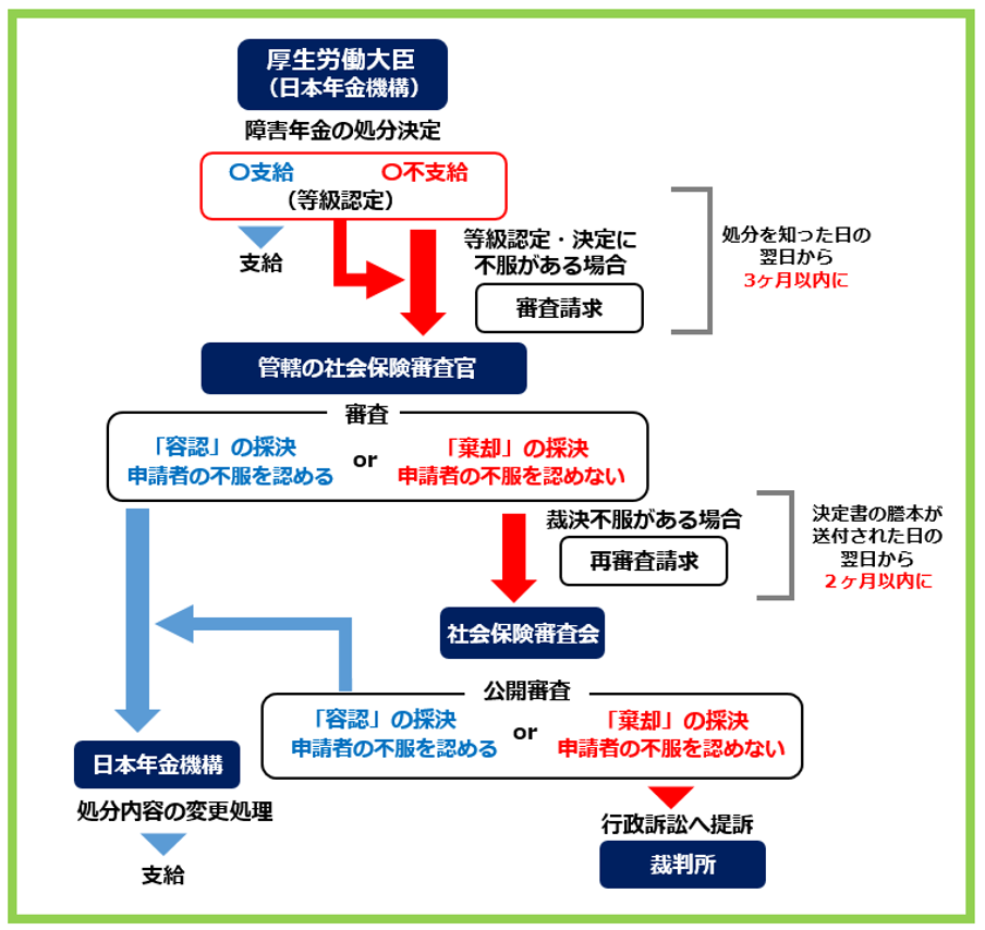 いずれも不服申し立て(審査請求)を行い、不支給審査を取り消し、再度障害年金受給を目指すことができます。